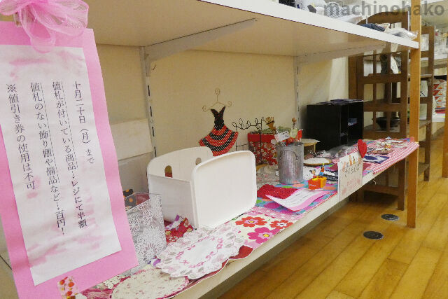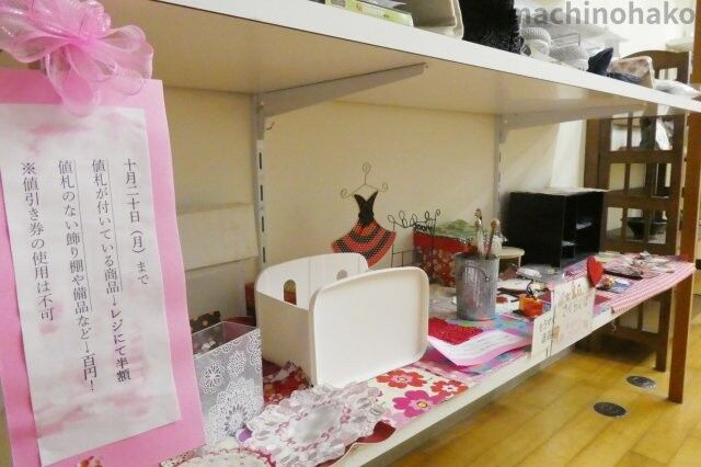 商品の数は少なくなりましたが、レジにて半額です。値札のない備品はどれでも100円です。どうぞよろしくお願い申し上げます。