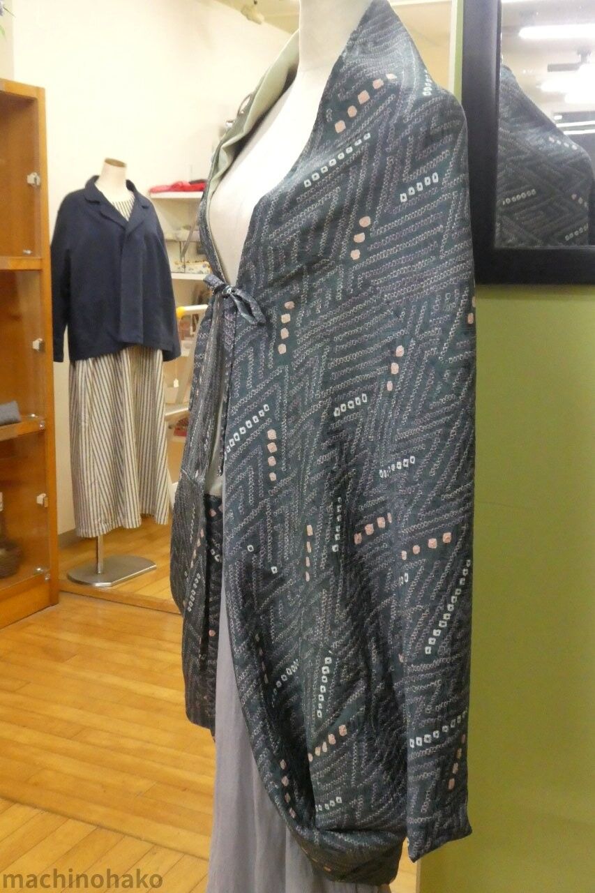 アイさんが正絹の着物を解いて作られました。裏地はライトグリーンの正絹です。着用済みなので、リサイクルとして右の最初のハンガーラックにございます。3800円です。
