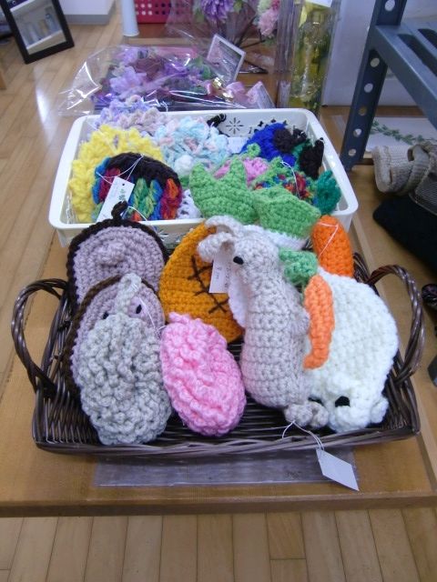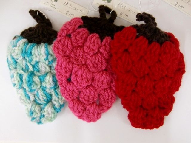 イチゴとドーナツたわしは、奥のテーブルの左側、先頭にございます。