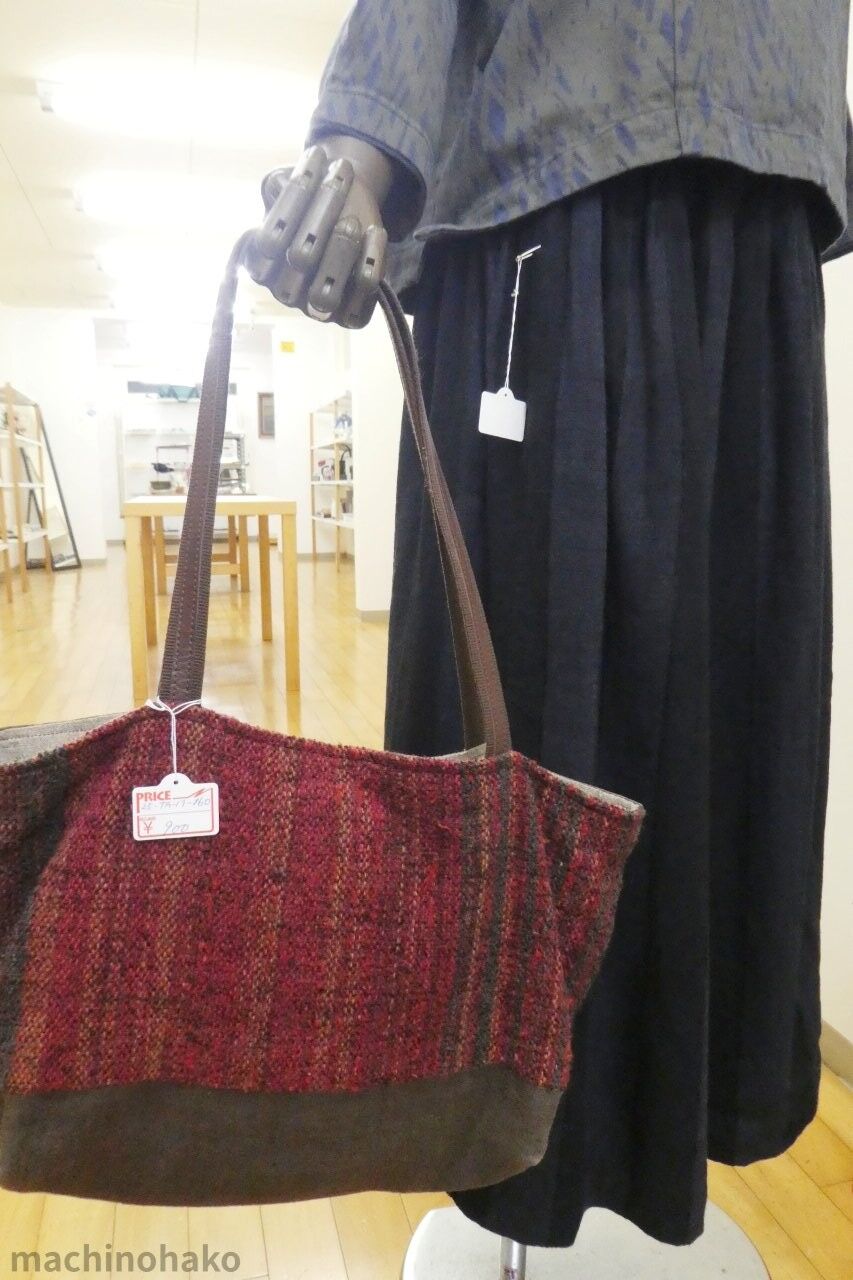 手さげの内側にマグネットボタン、ポケット、シミありで、900円です。スカートは綿55%、麻45%、裏地が綿100%、胴囲はゴムと紐で調節し、手洗い可の2800円です。