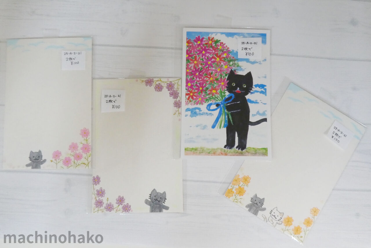 どれでも2枚で100円です。実は全部で3セット、つまり合計6枚ございます。後2枚は猫以外のイラストです。ぜひお越しになって、後2枚も含めお好きなペアをお選びください。