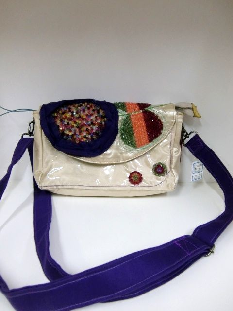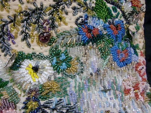 留め具はそのまま後部へ押して開けるのでなく、底を浮かしてから開けないとロックがかかったままになります。大量のビーズが使用されているので、表面のデザインは剥がれていないように見えますが、時折ビーズが落下しています。古いものなので、扱いは繊細にお願い致します。