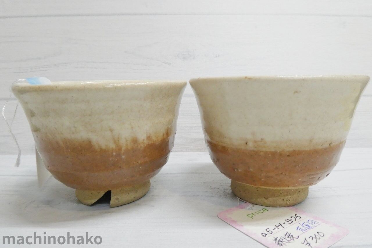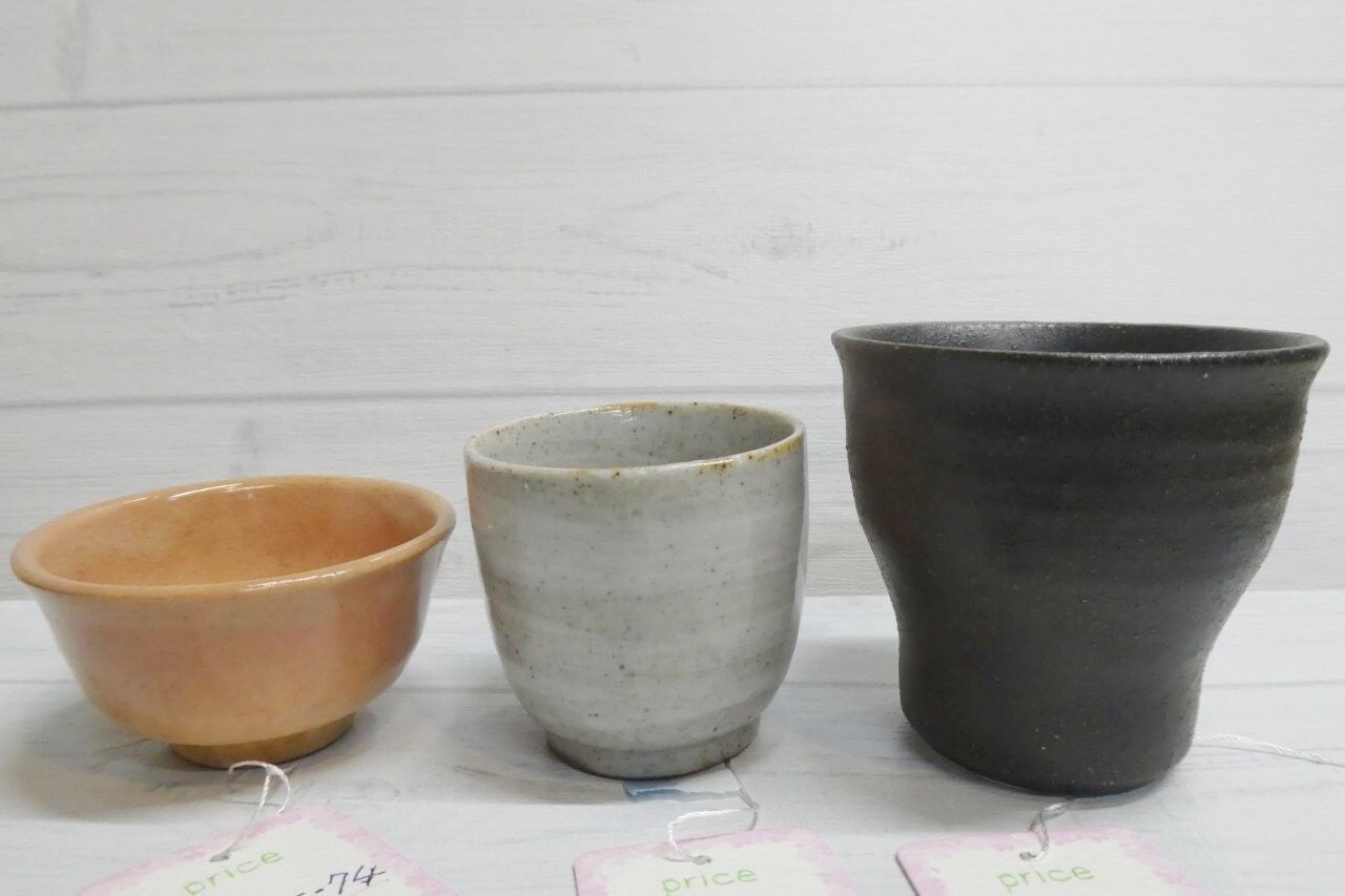 高さが約5.8cm、直径が約8cmなので、おちょこと言うより、ぐいのみに近いです。使うと徐々に器の色が変わる萩焼の特徴が見当たらない未使用品で、各300円です。