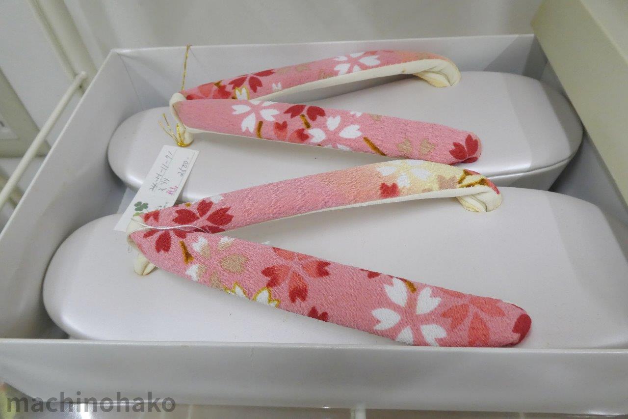 先程の赤地の七五三用着物と同柄です。ぞうりには、ストラップが付いているので、お子様にとって慣れないぞうりも履きやすいですよ。全部で1000円です。
